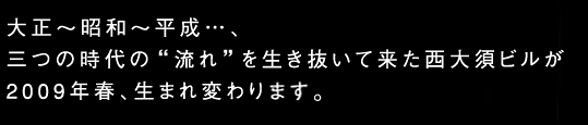 そして、誕生から88年経った2009年、西大須ビルはリノベーションによって生まれ変わります。西大須ビルは、名古屋市内でも歴史あるビルの一つであり、他には無い基本建築デザイン、風貌、空気感を持っています。それを今の形に変化させるのでは無く、今ある古き良き部分を更に引き立たせ、そこに現代の持つ良い“流れ”をうまく調和させ、他には決して出すことの出来ない、古今の空気感を作り出したリノベーションを施していきます。10年後、さらには20年後には、さらに存在感を増し、西大須のランドマークとなるでしょう。